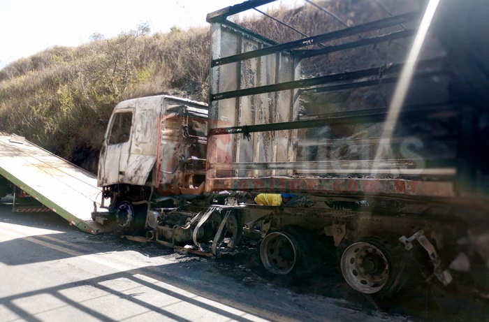 Carreta fica completamente destruida após pegar fogo na MGC-120 sentido Nova Era