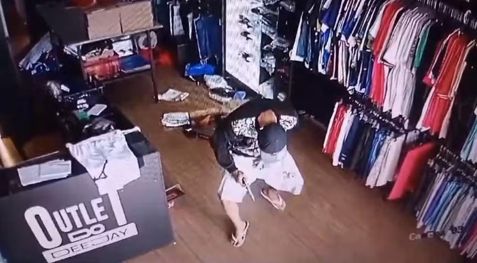 Eles conseguiram encher o carro de roupas, mas, antes de fugir, o jovem armado atirou acidentalmente na própria perna. Nas imagens, é possível ver que ele se assustou com o tiro, mas continuou andando.