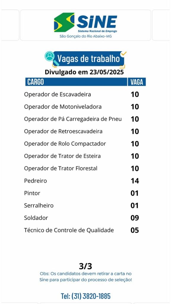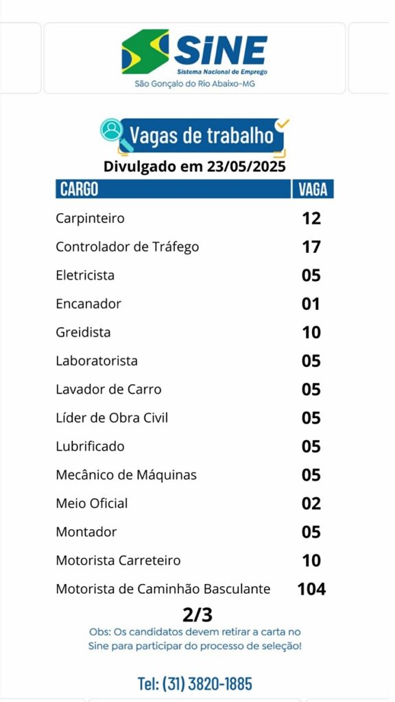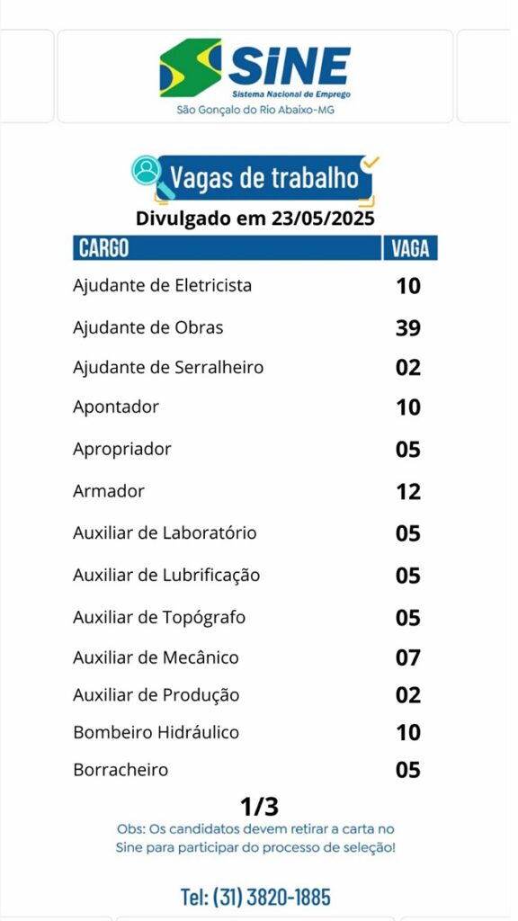 Oportunidades de empregos no SINE de São Gonçalo do Rio Abaixo para hoje 23 de maio de 2025