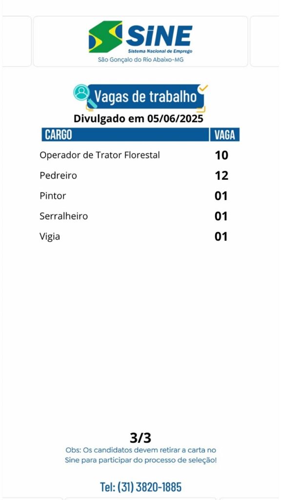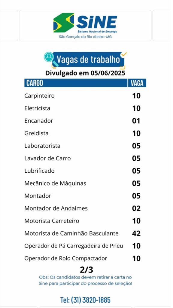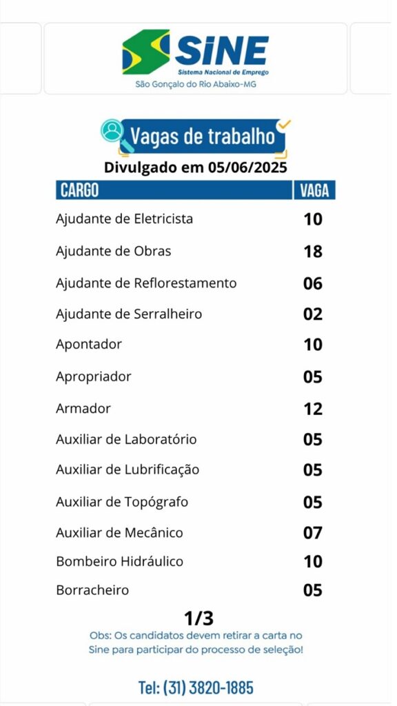Vagas de empregos no SINE de São Gonçalo do Rio Abaixo para hoje 05 de junho de 2025 05/06/2025, 14:10 0share Facebook WhatsApp Compartilhar Nosso horário de funcionamento é: Segunda a quinta-feira: das 08h às 17h Sexta-feira: das 08h às 16h(Exceto feriados) Deixe um comentário Cancelar respostaO seu endereço de email não será publicado. Campos obrigatórios marcados com *Comentário * Nome * Email * Site Guardar o meu nome, email e site neste navegador para a próxima vez que eu comentar.