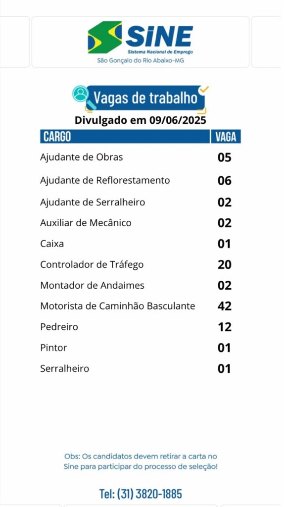 Vagas de empregos no SINE de São Gonçalo do Rio Abaixo para hoje 09 de junho de 2025
