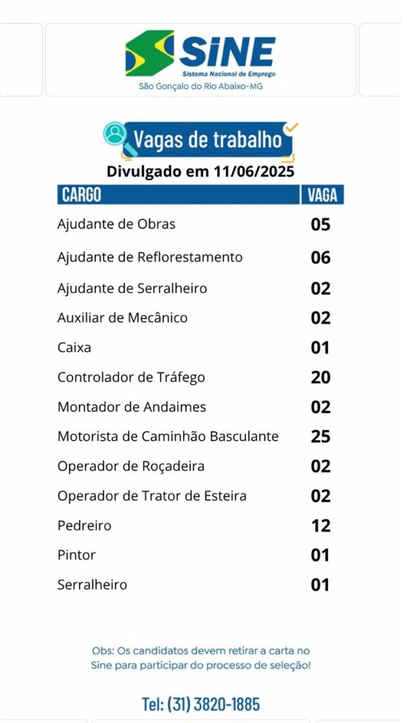 Vagas de empregos no SINE de São Gonçalo do Rio Abaixo para hoje 11 de junho de 2025