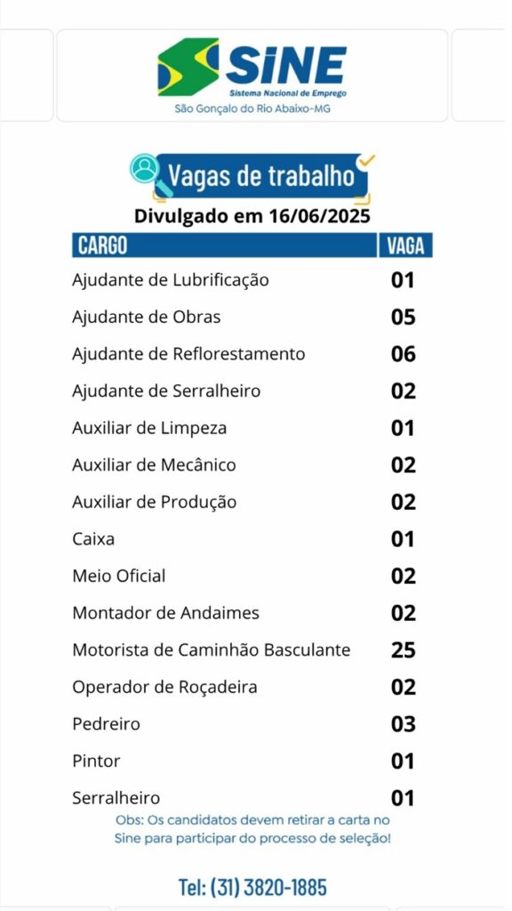 Vagas de empregos no SINE de São Gonçalo do Rio Abaixo para hoje 16 de junho de 2025 16/06/2025, 23:00 0share Facebook WhatsApp Compartilhar Nosso horário de funcionamento é: Segunda a quinta-feira: das 08h às 17h Sexta-feira: das 08h às 16h(Exceto feriados) Deixe um comentário Cancelar respostaO seu endereço de email não será publicado. Campos obrigatórios marcados com *Comentário * Nome * Email * Site Guardar o meu nome, email e site neste navegador para a próxima vez que eu comentar.