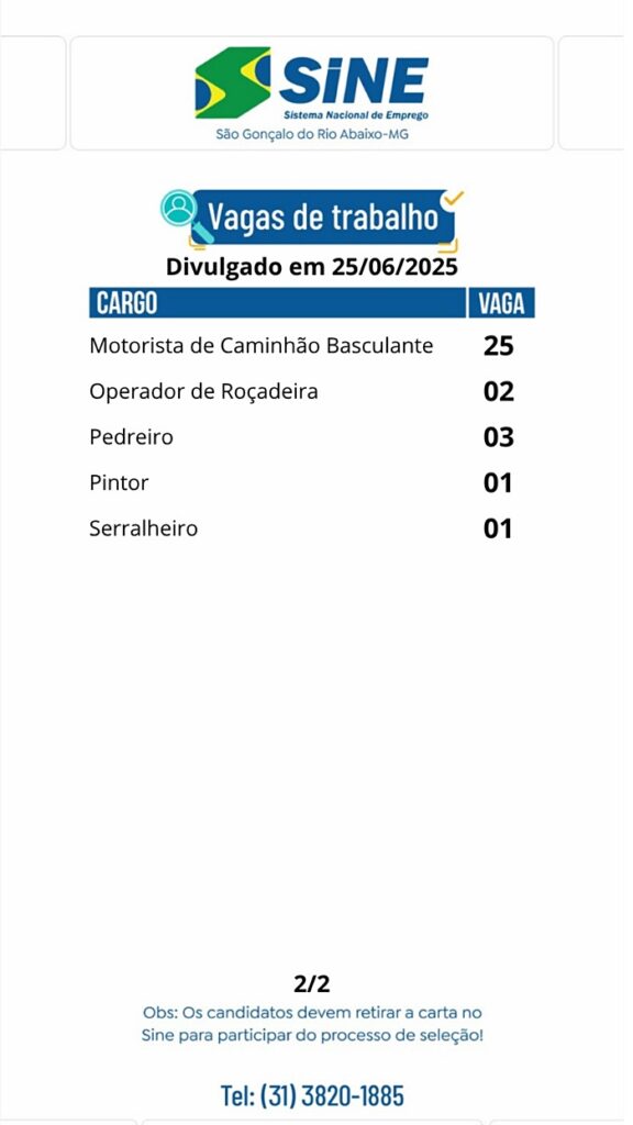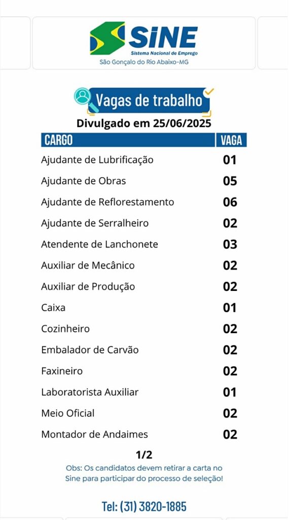 Vagas de empregos no SINE de São Gonçalo do Rio Abaixo para hoje 25 de junho de 2025 25/06/2025, 08:02 0share Facebook WhatsApp Compartilhar Nosso horário de funcionamento é: Segunda a quinta-feira: das 08h às 17h Sexta-feira: das 08h às 16h(Exceto feriados) Deixe um comentário Cancelar respostaO seu endereço de email não será publicado. Campos obrigatórios marcados com *Comentário * Nome * Email * Site Guardar o meu nome, email e site neste navegador para a próxima vez que eu comentar.