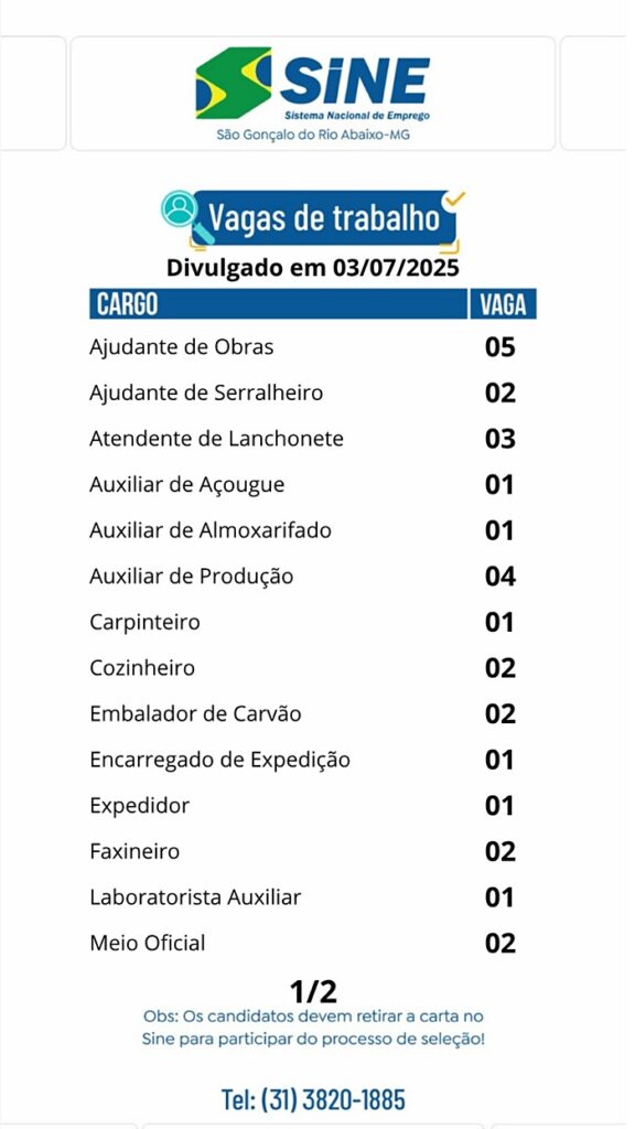 Vagas de empregos no SINE de São Gonçalo do Rio Abaixo para hoje 03 de julho de 2025 03/07/2025, 12:31 6shares Facebook WhatsApp Compartilhar Nosso horário de funcionamento é: Segunda a quinta-feira: das 08h às 17h Sexta-feira: das 08h às 16h(Exceto feriados) Deixe um comentário Cancelar respostaO seu endereço de email não será publicado. Campos obrigatórios marcados com *Comentário * Nome * Email * Site Guardar o meu nome, email e site neste navegador para a próxima vez que eu comentar.