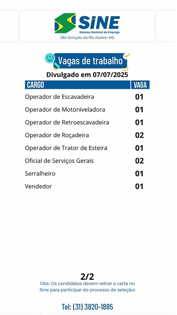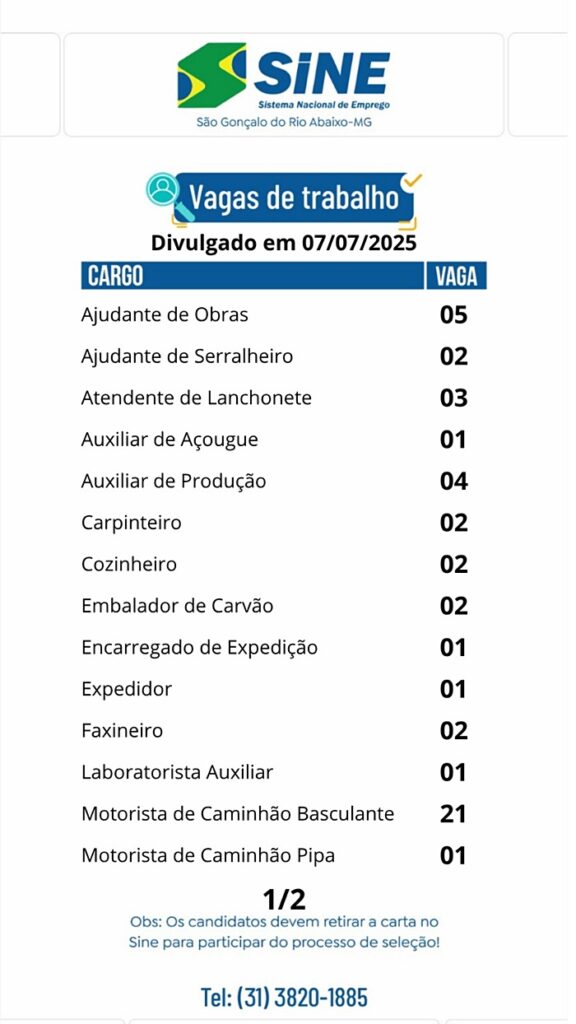 Vagas de empregos no SINE de São Gonçalo do Rio Abaixo para hoje 07 de julho de 2025 07/07/2025, 15:20 0share Facebook WhatsApp Compartilhar Nosso horário de funcionamento é: Segunda a quinta-feira: das 08h às 17h Sexta-feira: das 08h às 16h(Exceto feriados) Deixe um comentário Cancelar respostaO seu endereço de email não será publicado. Campos obrigatórios marcados com *Comentário * Nome * Email * Site Guardar o meu nome, email e site neste navegador para a próxima vez que eu comentar.