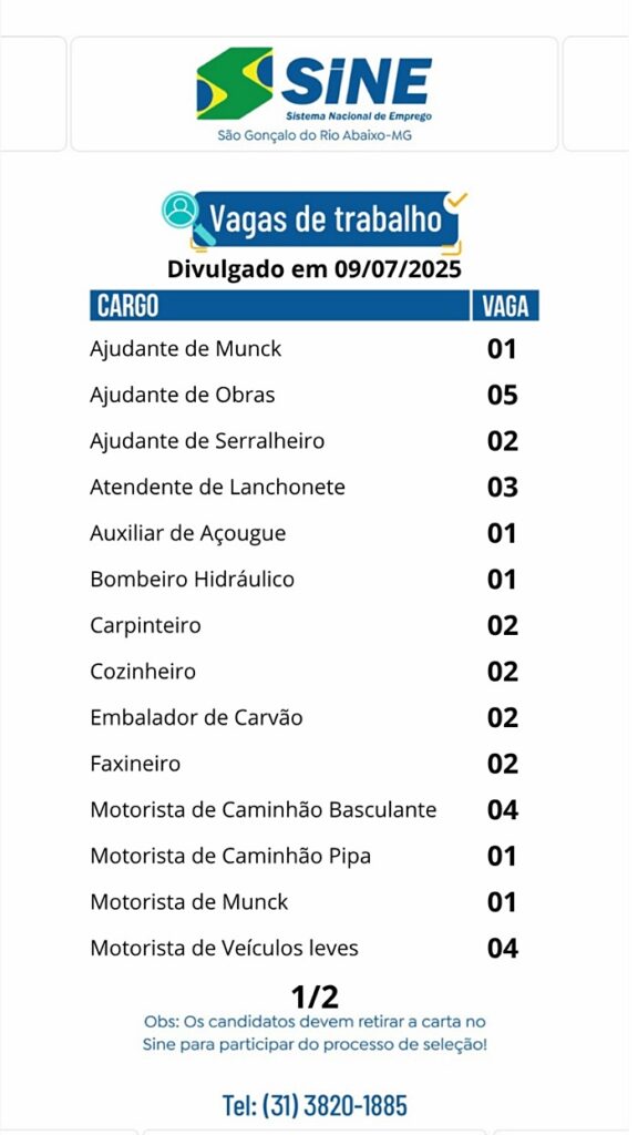 Vagas de empregos no SINE de São Gonçalo do Rio Abaixo para hoje 09 de julho de 2025 09/07/2025, 11:14 0share Facebook WhatsApp Compartilhar Nosso horário de funcionamento é: Segunda a quinta-feira: das 08h às 17h Sexta-feira: das 08h às 16h(Exceto feriados) Deixe um comentário Cancelar respostaO seu endereço de email não será publicado. Campos obrigatórios marcados com *Comentário * Nome * Email * Site Guardar o meu nome, email e site neste navegador para a próxima vez que eu comentar.