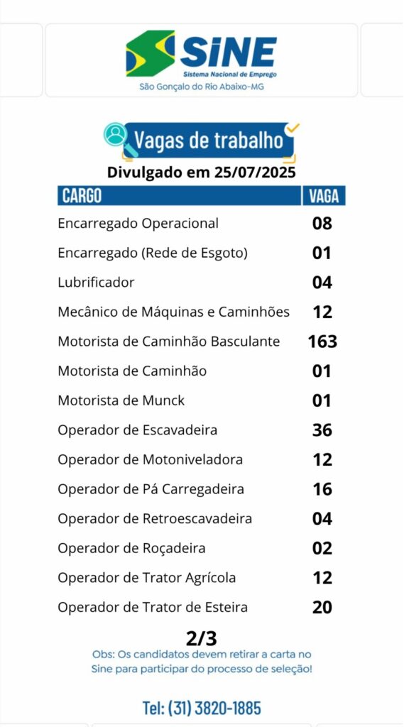 Vagas de empregos no SINE de São Gonçalo do Rio Abaixo para hoje 25 de julho de 2025 25/07/2025, 10:40 1share Facebook WhatsApp Compartilhar Nosso horário de funcionamento é: Segunda a quinta-feira: das 08h às 17h Sexta-feira: das 08h às 16h(Exceto feriados) Deixe um comentário Cancelar respostaO seu endereço de email não será publicado. Campos obrigatórios marcados com *Comentário * Nome * Email * Site Guardar o meu nome, email e site neste navegador para a próxima vez que eu comentar.