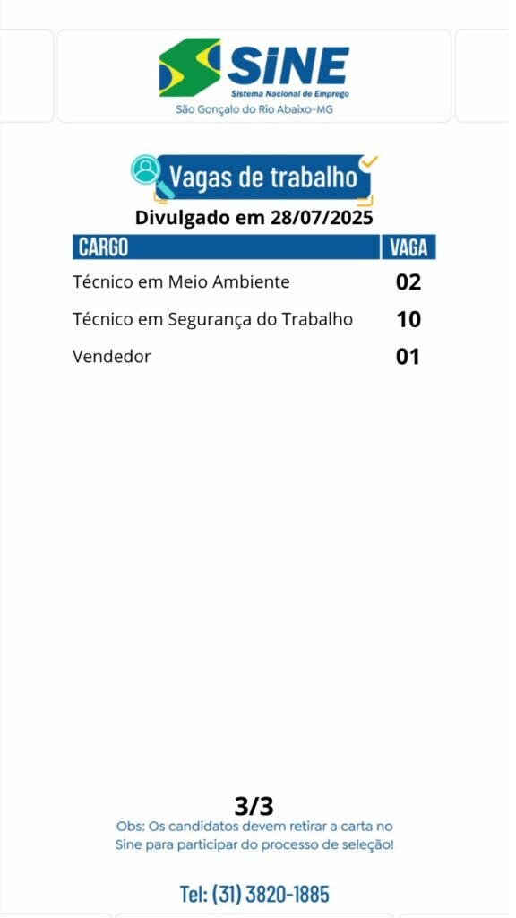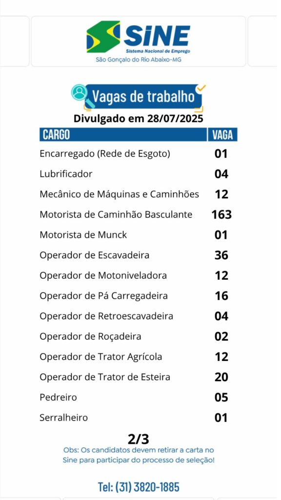 Vagas de empregos no SINE de São Gonçalo do Rio Abaixo para hoje 28 de julho de 2025
