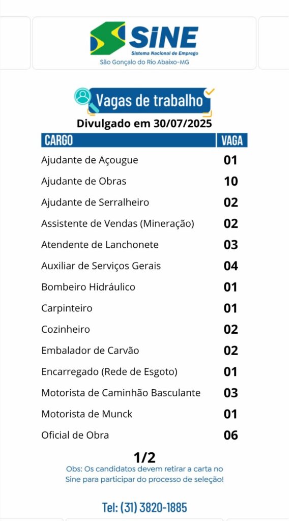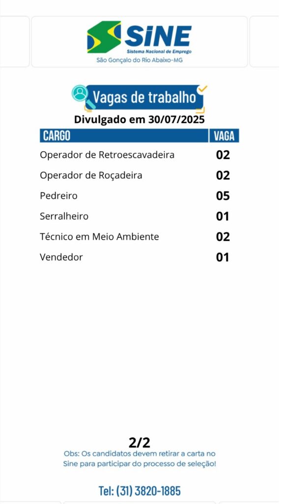 Vagas de empregos no SINE de São Gonçalo do Rio Abaixo para hoje 30 de julho de 2025 30/07/2025, 08:00 0share Facebook WhatsApp Compartilhar Nosso horário de funcionamento é: Segunda a quinta-feira: das 08h às 17h Sexta-feira: das 08h às 16h(Exceto feriados) Deixe um comentário Cancelar respostaO seu endereço de email não será publicado. Campos obrigatórios marcados com *Comentário * Nome * Email * Site Guardar o meu nome, email e site neste navegador para a próxima vez que eu comentar.