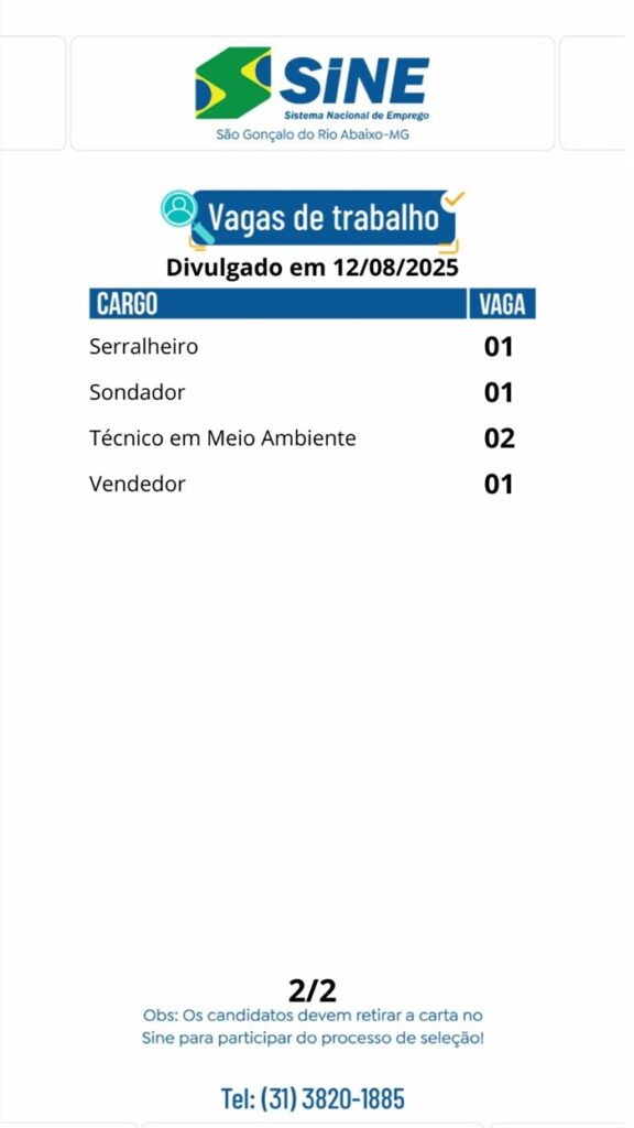 Vagas de empregos no SINE de São Gonçalo do Rio Abaixo para hoje 12 de agosto de 2025