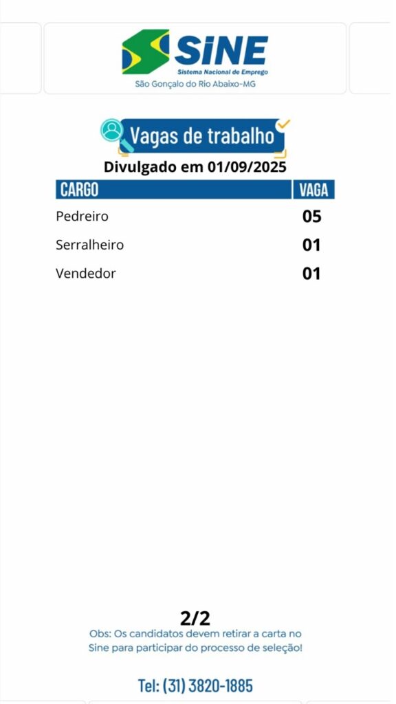 Vagas de empregos no SINE de São Gonçalo do Rio Abaixo para hoje 01 de setembro de 2025 01/09/2025, 13:20 0share Facebook WhatsApp Compartilhar Nosso horário de funcionamento é: Segunda a quinta-feira: das 08h às 17h Sexta-feira: das 08h às 16h(Exceto feriados) Deixe um comentário Cancelar respostaO seu endereço de email não será publicado. Campos obrigatórios marcados com *Comentário * Nome * Email * Site Guardar o meu nome, email e site neste navegador para a próxima vez que eu comentar.