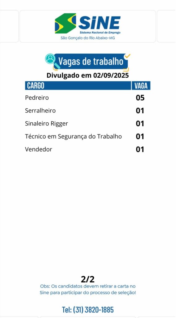 Vagas de empregos no SINE de São Gonçalo do Rio Abaixo para hoje 02 de setembro de 2025 02/09/2025, 22:55 0share Facebook WhatsApp Compartilhar Nosso horário de funcionamento é: Segunda a quinta-feira: das 08h às 17h Sexta-feira: das 08h às 16h(Exceto feriados) Deixe um comentário Cancelar respostaO seu endereço de email não será publicado. Campos obrigatórios marcados com *Comentário * Nome * Email * Site Guardar o meu nome, email e site neste navegador para a próxima vez que eu comentar.
