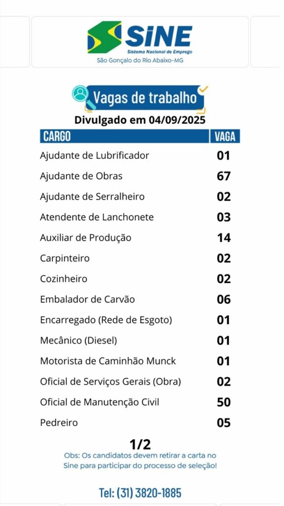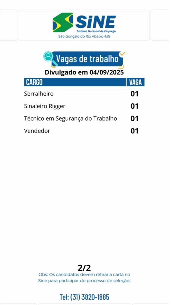 Vagas de empregos no SINE de São Gonçalo do Rio Abaixo para hoje 04 de setembro de 2025 04/09/2025, 13:01 0share Facebook WhatsApp Compartilhar Nosso horário de funcionamento é: Segunda a quinta-feira: das 08h às 17h Sexta-feira: das 08h às 16h(Exceto feriados) Deixe um comentário Cancelar respostaO seu endereço de email não será publicado. Campos obrigatórios marcados com *Comentário * Nome * Email * Site Guardar o meu nome, email e site neste navegador para a próxima vez que eu comentar.