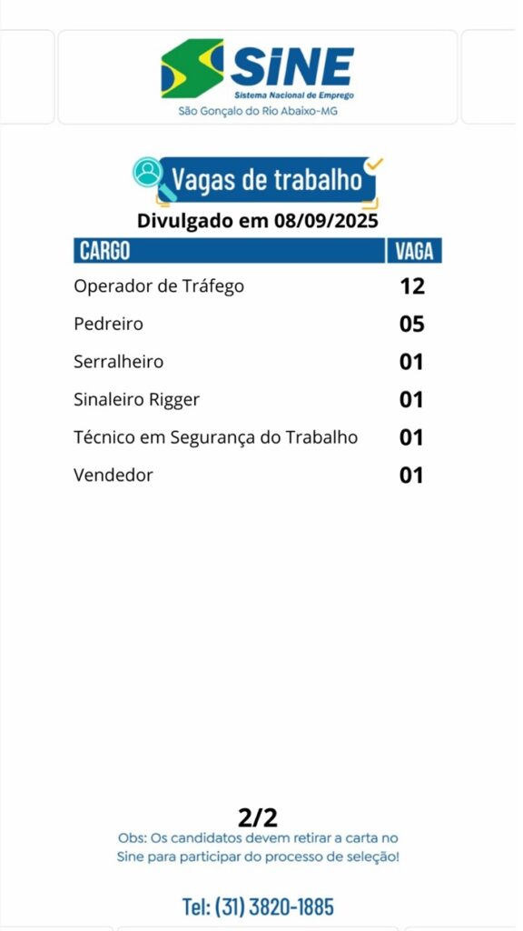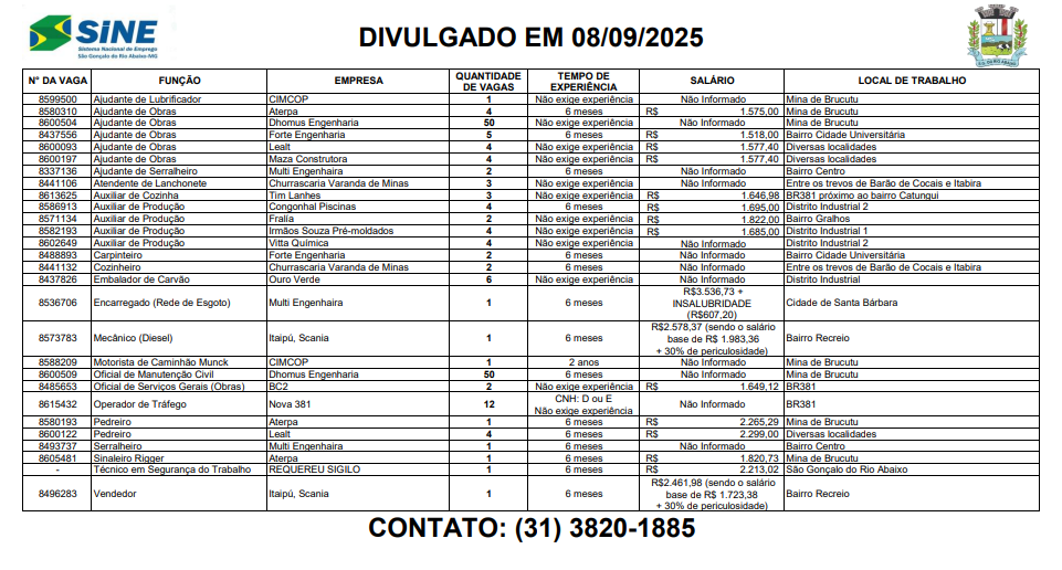 Vagas de empregos no SINE de São Gonçalo do Rio Abaixo para hoje 08 de setembro de 2025