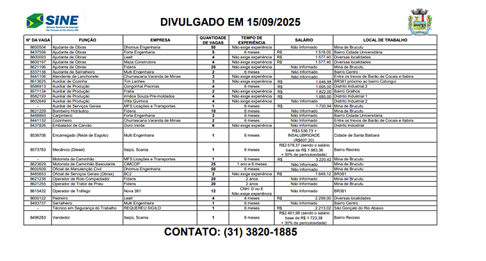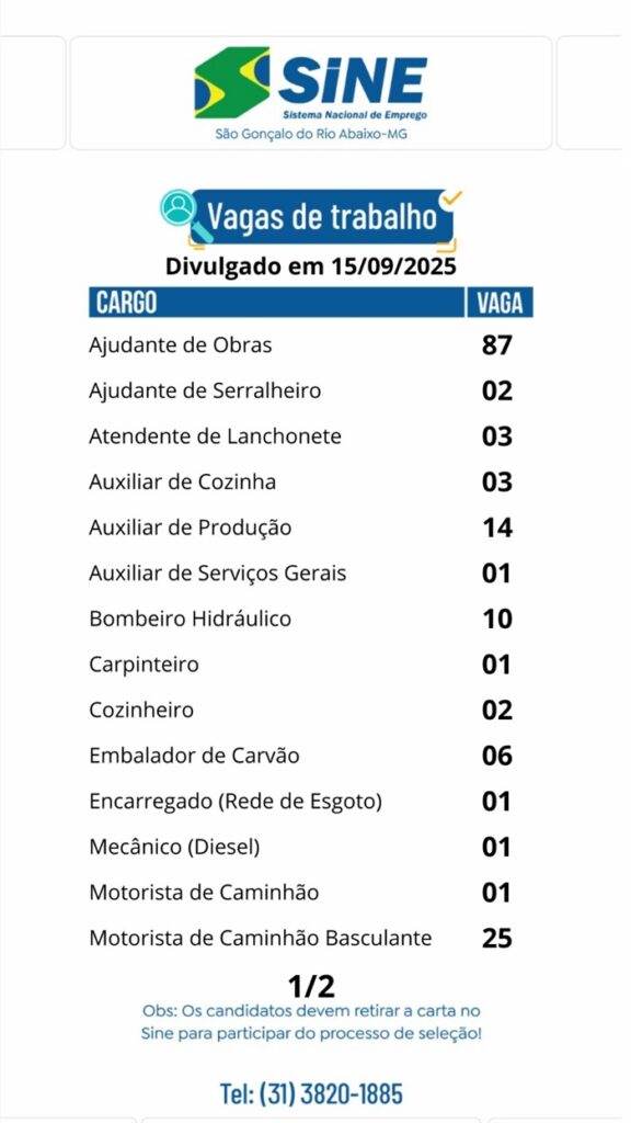 Vagas de empregos no SINE de São Gonçalo do Rio Abaixo para hoje 15 de setembro de 2025 15/09/2025, 11:01 0share Facebook WhatsApp Compartilhar Nosso horário de funcionamento é: Segunda a quinta-feira: das 08h às 17h Sexta-feira: das 08h às 16h(Exceto feriados) Deixe um comentário Cancelar respostaO seu endereço de email não será publicado. Campos obrigatórios marcados com *Comentário * Nome * Email * Site Guardar o meu nome, email e site neste navegador para a próxima vez que eu comentar.