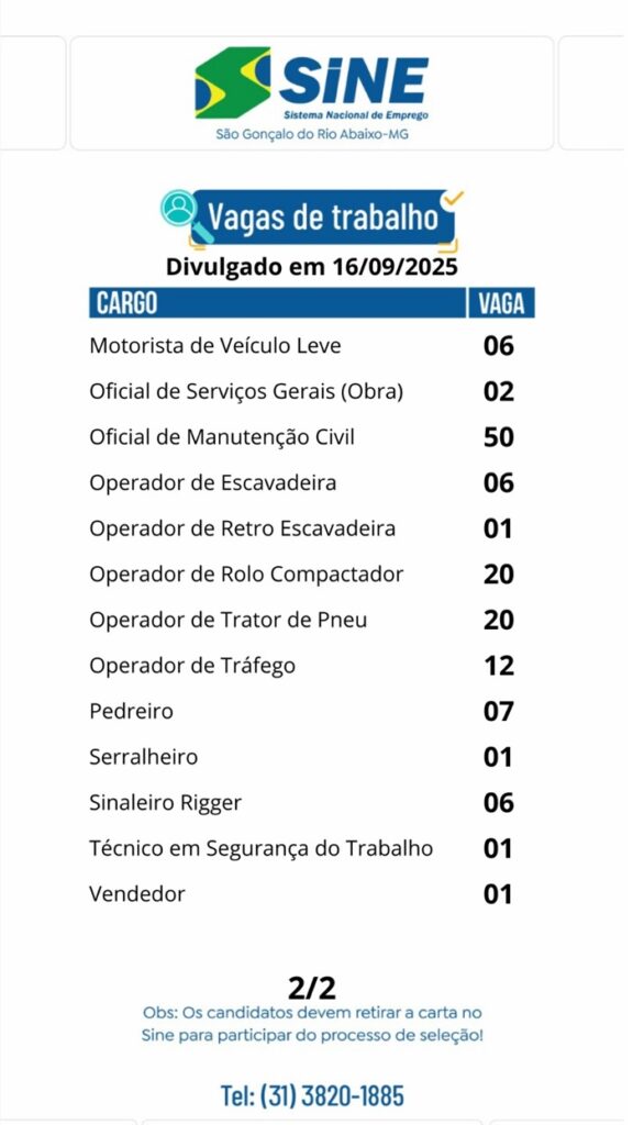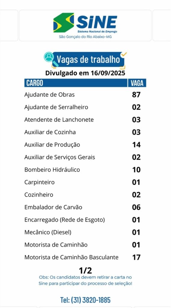 Vagas de empregos no SINE de São Gonçalo do Rio Abaixo para hoje 16 de setembro de 2025 16/09/2025, 11:11 1share Facebook WhatsApp Compartilhar Nosso horário de funcionamento é: Segunda a quinta-feira: das 08h às 17h Sexta-feira: das 08h às 16h(Exceto feriados) Deixe um comentário Cancelar respostaO seu endereço de email não será publicado. Campos obrigatórios marcados com *Comentário * Nome * Email * Site Guardar o meu nome, email e site neste navegador para a próxima vez que eu comentar.