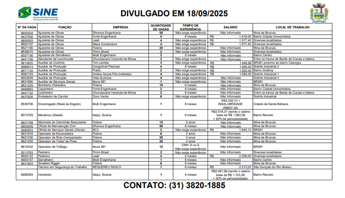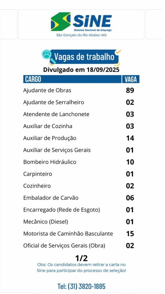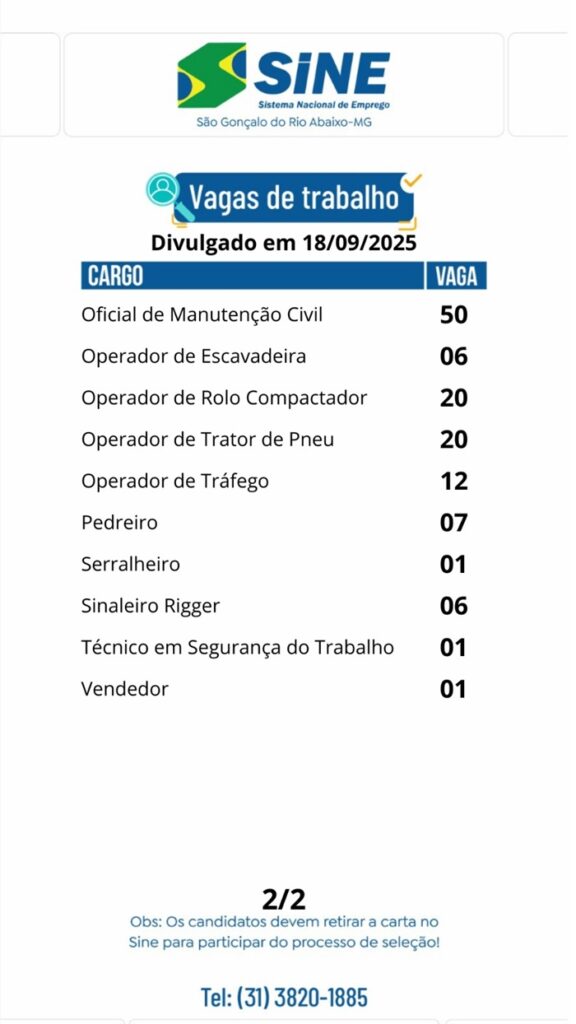 Vagas de empregos no SINE de São Gonçalo do Rio Abaixo para hoje 18 de setembro de 2025