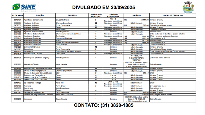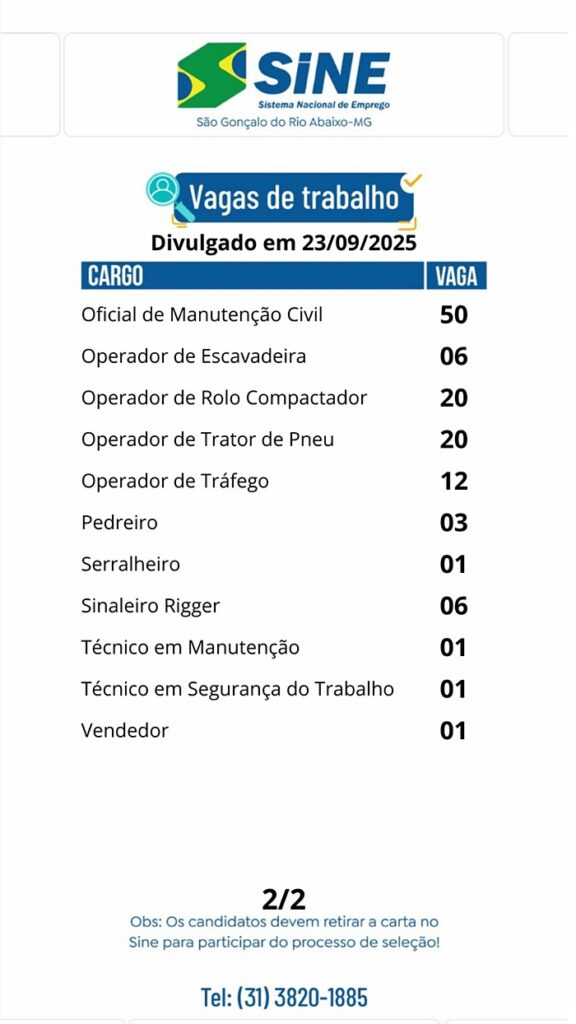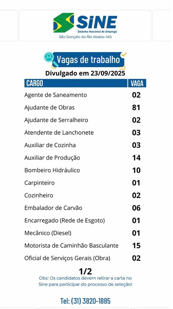 Vagas de empregos no SINE de São Gonçalo do Rio Abaixo para hoje 23 de setembro de 2025 23/09/2025, 12:23 0share Facebook WhatsApp Compartilhar Nosso horário de funcionamento é: Segunda a quinta-feira: das 08h às 17h Sexta-feira: das 08h às 16h(Exceto feriados) Deixe um comentário Cancelar respostaO seu endereço de email não será publicado. Campos obrigatórios marcados com *Comentário * Nome * Email * Site Guardar o meu nome, email e site neste navegador para a próxima vez que eu comentar.