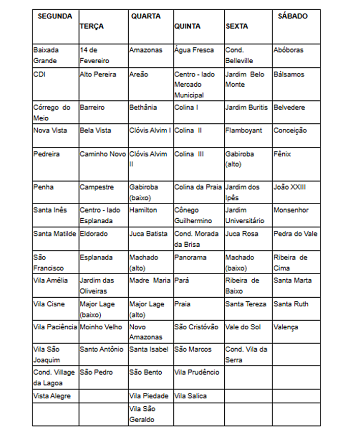 De acordo com o plano que estabelece o rodízio de abastecimento: a cidade foi dividida em seis regiões, e cada uma terá o fornecimento suspenso um dia por semana, das 7h30 às 21h. Aos domingos, não haverá racionamento.