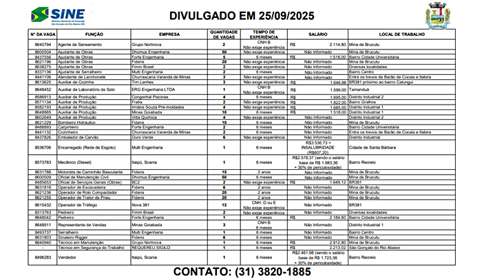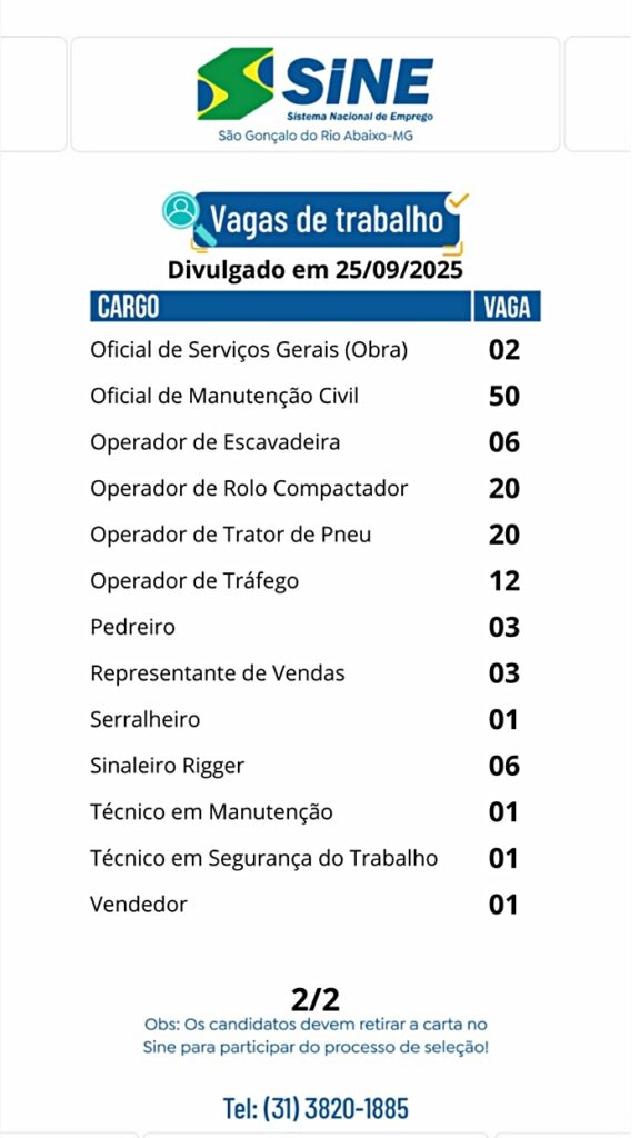 Vagas de empregos no SINE de São Gonçalo do Rio Abaixo para hoje 25 de setembro de 2025 25/09/2025, 12:45 0share Facebook WhatsApp Compartilhar Nosso horário de funcionamento é: Segunda a quinta-feira: das 08h às 17h Sexta-feira: das 08h às 16h(Exceto feriados) Deixe um comentário Cancelar respostaO seu endereço de email não será publicado. Campos obrigatórios marcados com *Comentário * Nome * Email * Site Guardar o meu nome, email e site neste navegador para a próxima vez que eu comentar.