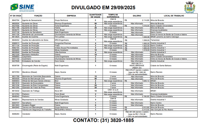Vagas de empregos no SINE de São Gonçalo do Rio Abaixo para hoje 29 de setembro de 2025 29/09/2025, 09:32 0share Facebook WhatsApp Compartilhar Nosso horário de funcionamento é: Segunda a quinta-feira: das 08h às 17h Sexta-feira: das 08h às 16h(Exceto feriados) Deixe um comentário Cancelar respostaO seu endereço de email não será publicado. Campos obrigatórios marcados com *Comentário * Nome * Email * Site Guardar o meu nome, email e site neste navegador para a próxima vez que eu comentar.