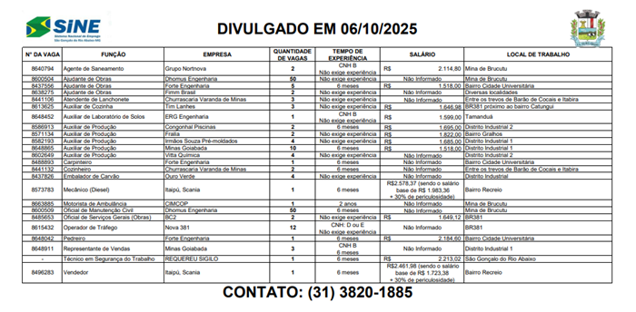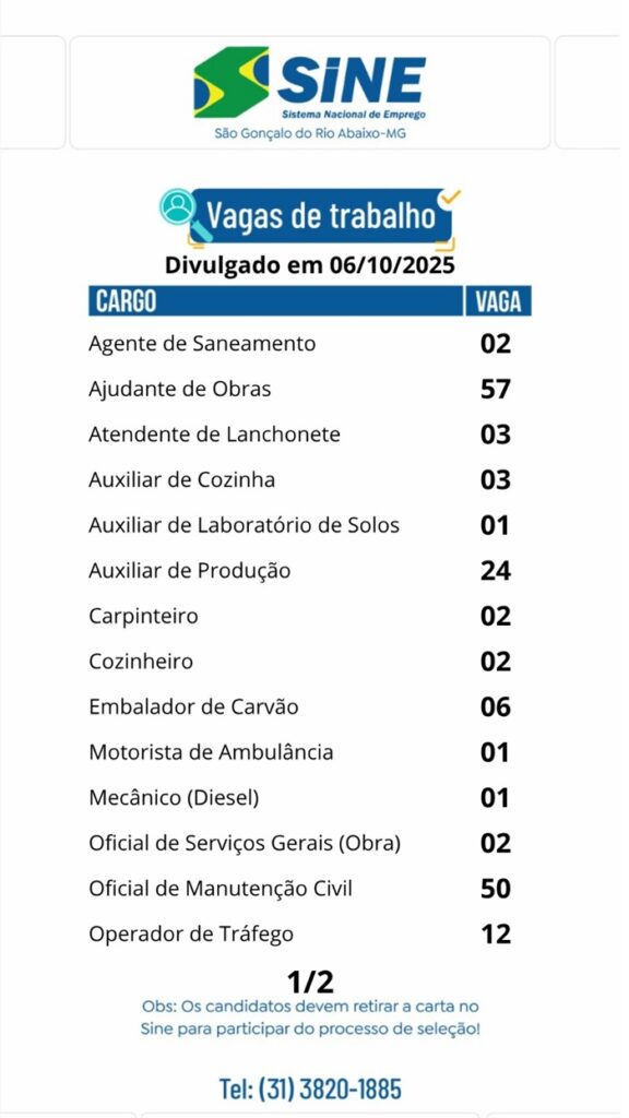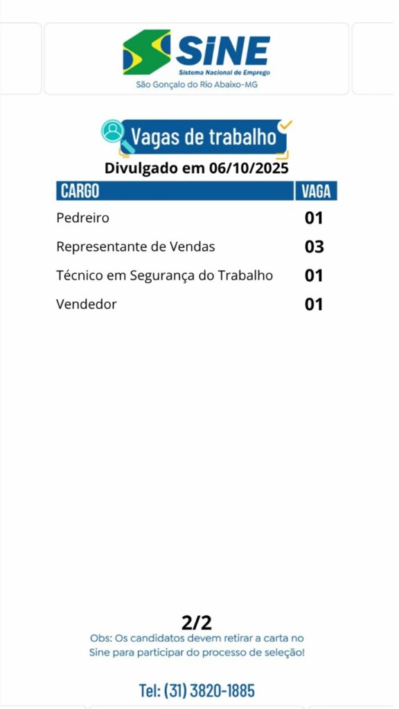Vagas de empregos no SINE de São Gonçalo do Rio Abaixo para hoje 06 de outubro de 2025 06/10/2025, 12:35 0share Facebook WhatsApp Compartilhar Nosso horário de funcionamento é: Segunda a quinta-feira: das 08h às 17h Sexta-feira: das 08h às 16h(Exceto feriados) Deixe um comentário Cancelar respostaO seu endereço de email não será publicado. Campos obrigatórios marcados com *Comentário * Nome * Email * Site Guardar o meu nome, email e site neste navegador para a próxima vez que eu comentar.