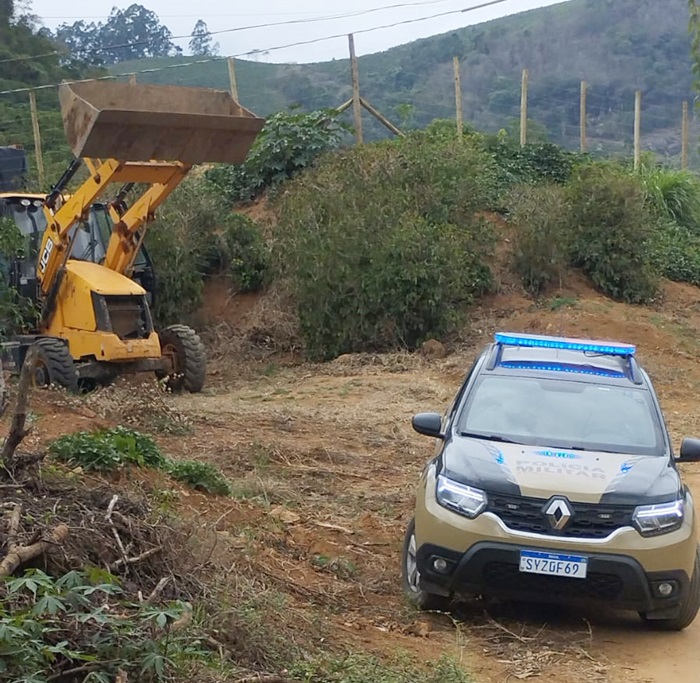 Com base nas denúncias recebidas e no sinal do rastreador instalado no maquinário, as equipes policiais iniciaram as diligências na zona rural do município. Em determinado momento, o sinal do equipamento foi interrompido, mas os militares mantiveram o cerco e prosseguiram com as buscas, localizando o veículo em meio a uma área de difícil acesso.