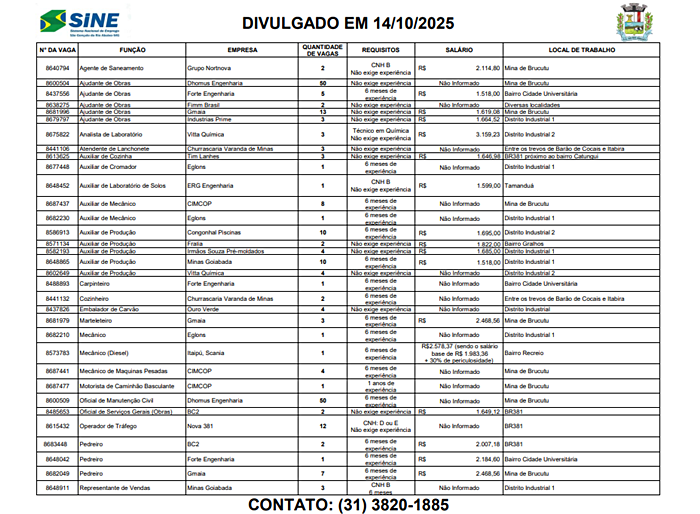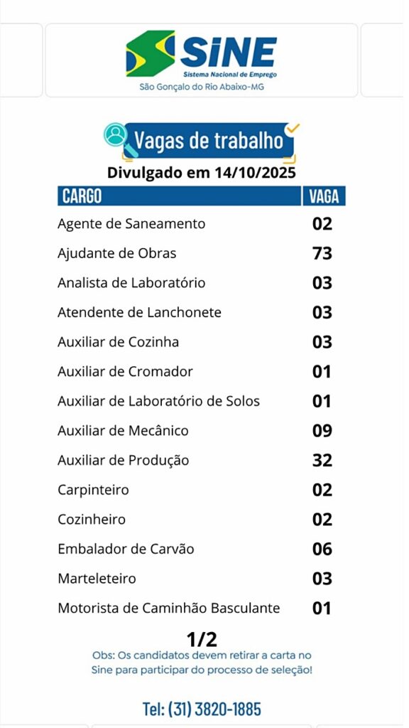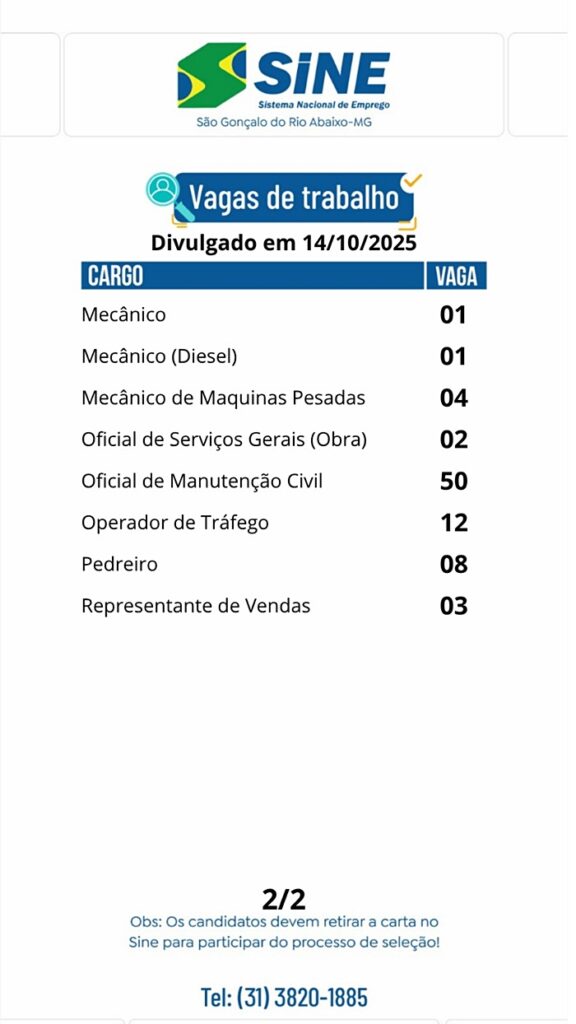 Vagas de empregos no SINE de São Gonçalo do Rio Abaixo para hoje 14 de outubro de 2025 14/10/2025, 11:21 0share Facebook WhatsApp Compartilhar Nosso horário de funcionamento é: Segunda a quinta-feira: das 08h às 17h Sexta-feira: das 08h às 16h(Exceto feriados) Deixe um comentário Cancelar respostaO seu endereço de email não será publicado. Campos obrigatórios marcados com *Comentário * Nome * Email * Site Guardar o meu nome, email e site neste navegador para a próxima vez que eu comentar.