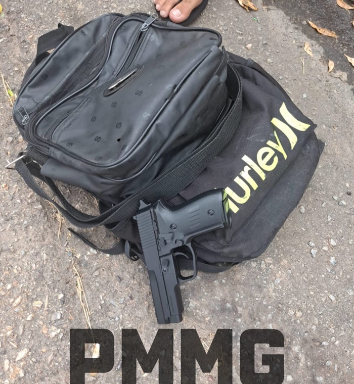 Durante a busca pessoal, os militares encontraram com um dos adolescentes um simulacro de arma de fogo, de cor preta e sem a ponta vermelha, com aparência semelhante à de uma pistola real. No local da abordagem, um terceiro adolescente se apresentou e assumiu ser o proprietário do objeto.