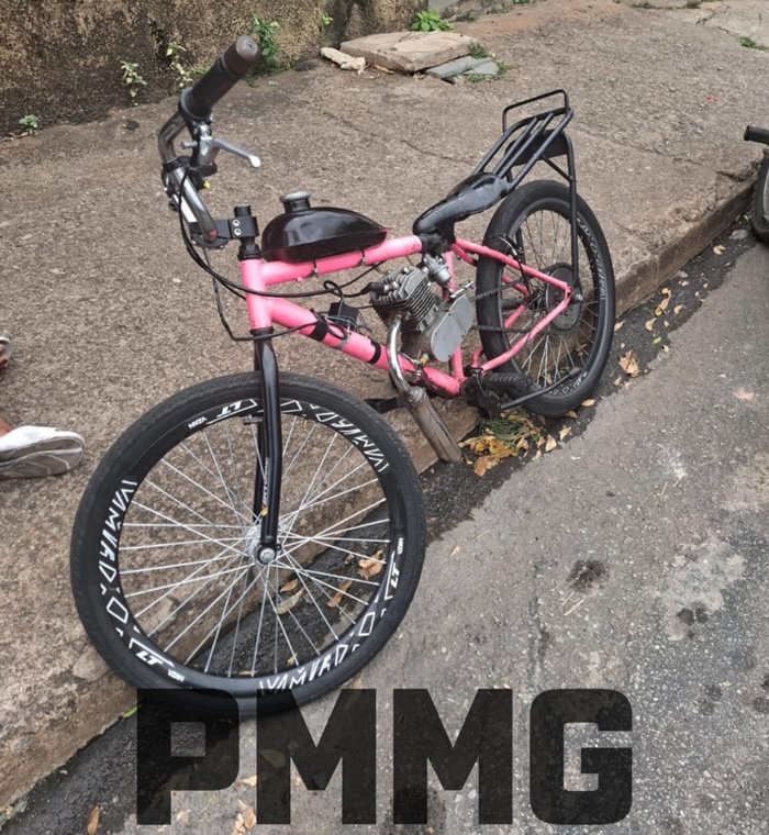 A bicicleta motorizada, de cor rosa, foi apreendida por apresentar modificações e irregularidades conforme o Código de Trânsito Brasileiro. O simulacro também foi apreendido e encaminhado à Delegacia de Polícia Civil para as providências legais.