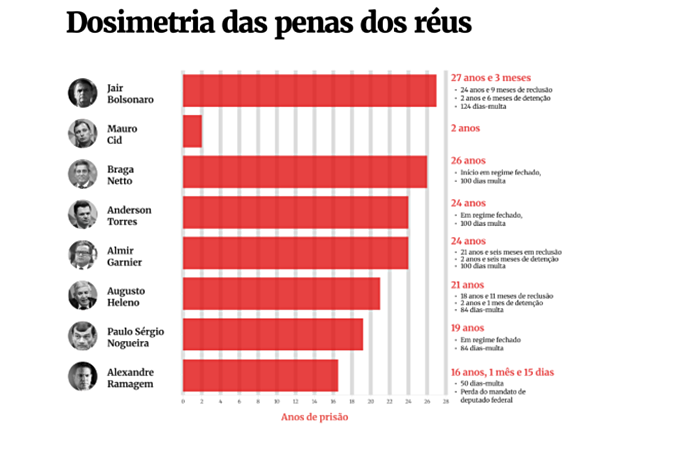 A segunda pena mais pesada foi direcionada ao ex-ministro da defesa de Bolsonaro, general Braga Netto, estabelecida em 26 anos.
