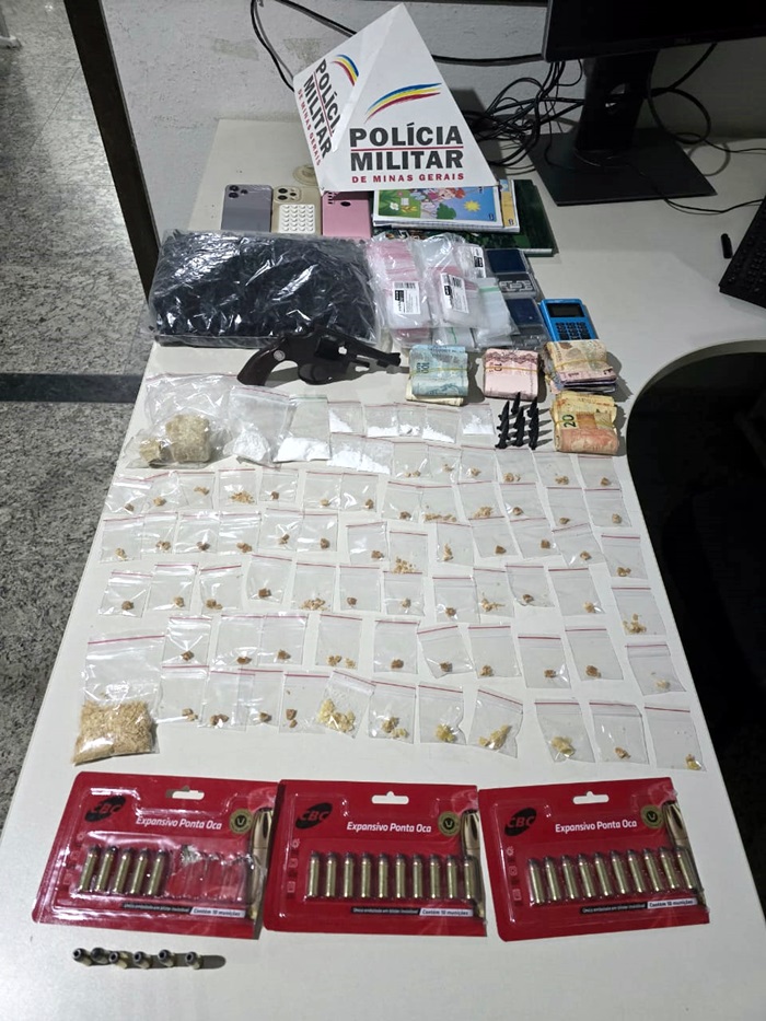 Dando continuidade às diligências, as equipes seguiram até o imóvel de um homem, 30 anos, identificado nas investigações como responsável por coordenar o tráfico na região. No local, foram encontrados um revólver calibre .32 com munições, mais entorpecentes já fracionados para venda, balança de precisão, embalagens, máquina de cartão e celulares utilizados na atividade criminosa.