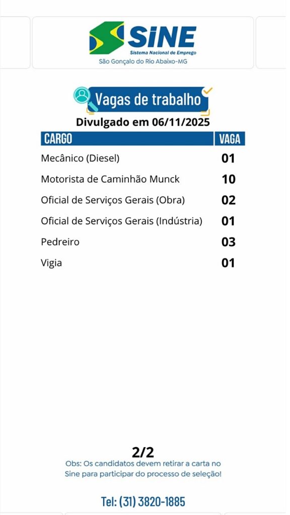 Segue a relação das vagas em aberto na data de hoje no SINE de São Gonçalo do Rio Abaixo – MG.