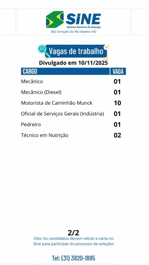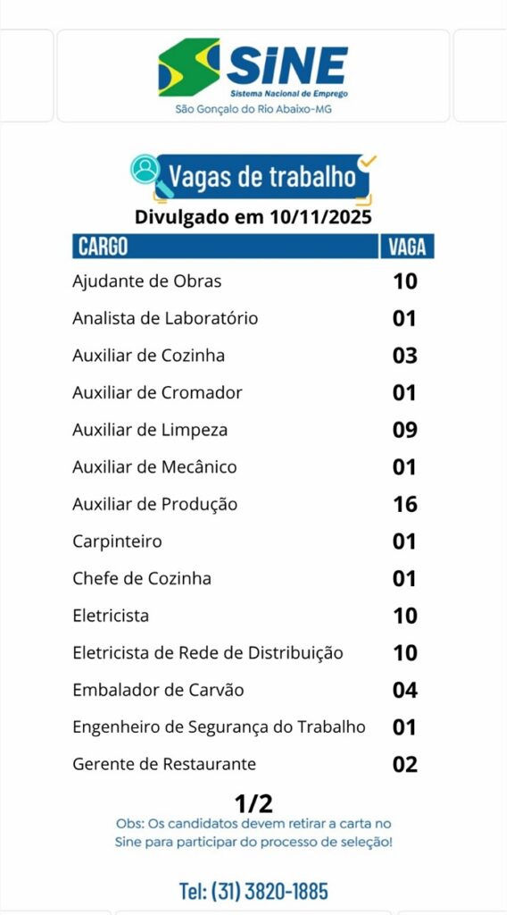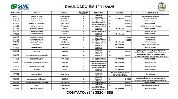 Vagas de empregos no SINE de São Gonçalo do Rio Abaixo para hoje 10 de novembro de 2025