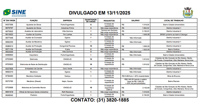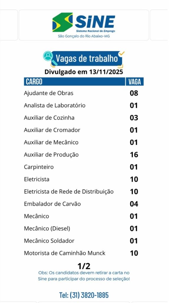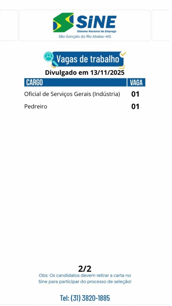 Segue a relação das vagas em aberto na data de hoje no SINE de São Gonçalo do Rio Abaixo – MG.