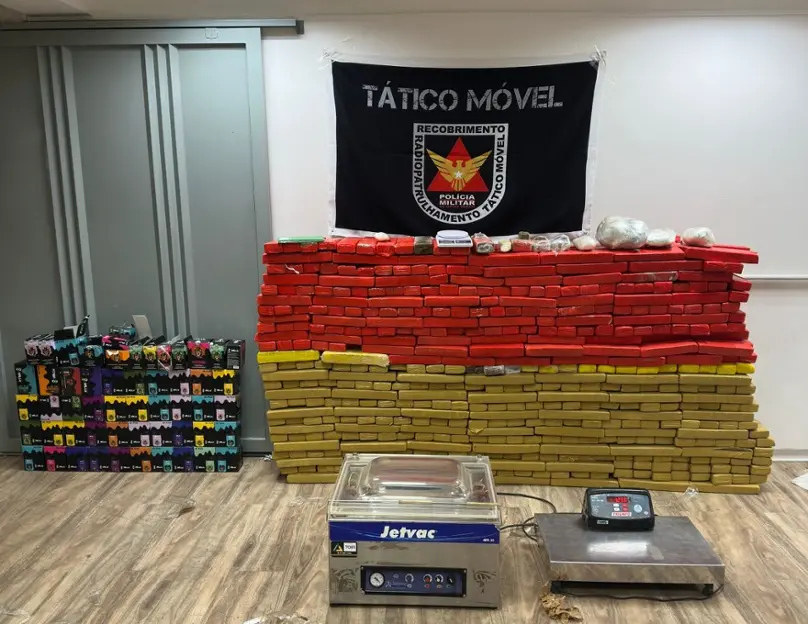 A Polícia Militar de Minas Gerais (PMMG), por meio do 32º BPM, durante uma operação policial, no bairro Jardim Holanda, em Uberlândia, na noite dessa quinta-feira, apreendeu 672 barras de maconha, 486 cigarros eletrônicos, balanças de precisão e equipamentos usados no preparo e embalagem dos materiais. Um suspeito de 29 anos foi preso e com ele apreendido um veículo Fiat/Fiorino com queixa de furto em 22/10/2024.