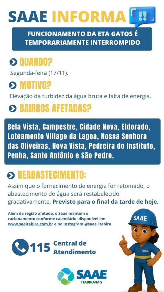 O Serviço Autônomo de Água e Esgoto (Saae) de Itabira informa que, nesta segunda-feira (17/11), a Estação de Tratamento de Água (ETA) Gatos teve seu funcionamento temporariamente interrompido durante a madrugada para adequação da qualidade da água tratada. A medida foi necessária devido ao nível extremamente elevado de turbidez da água bruta captada, indicando grande quantidade de material particulado em suspensão e impossibilitando o tratamento dentro dos padrões de potabilidade exigidos.