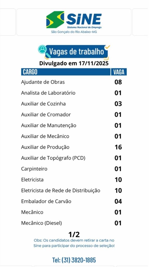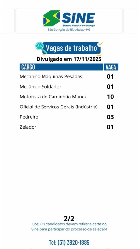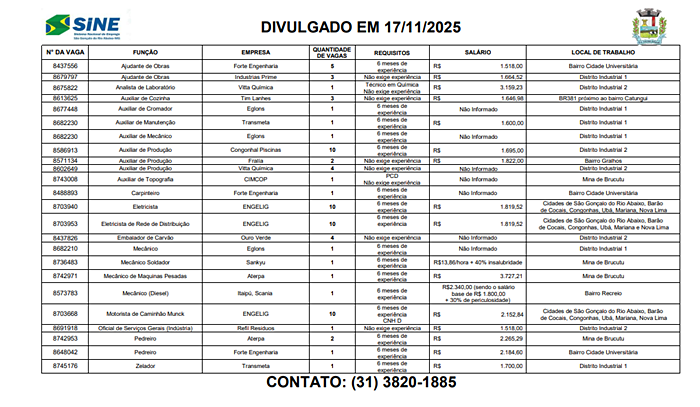 Vagas de empregos no SINE de São Gonçalo do Rio Abaixo para hoje 17 de novembro de 2025