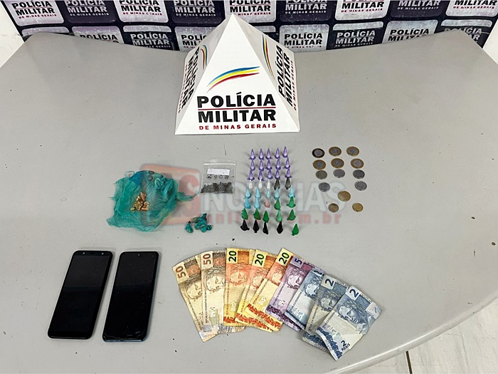 Material apreendido, 40 pinos de cocaína, quatro pedras de crack, 01 porção maior de crack, uma porção de maconha, cerca de R$ 179,95 em dinheiro, dois aparelhos celulares.