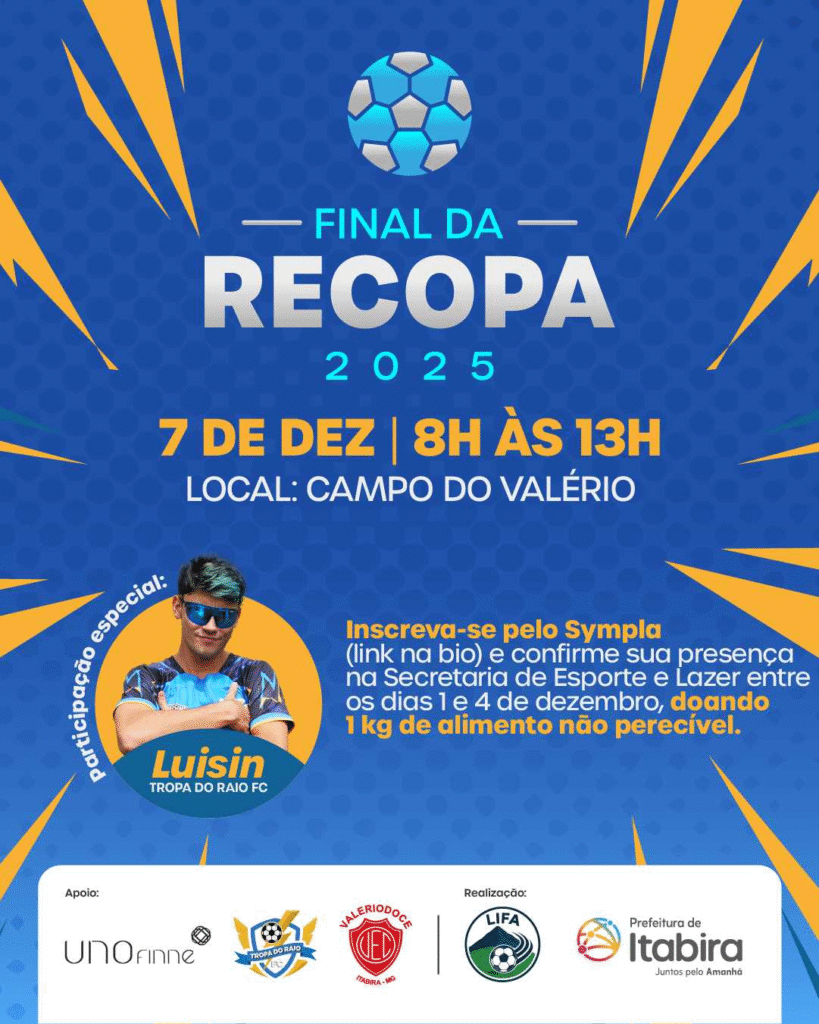 Hoje, ele é o criador e líder da Tropa do Raio, um dos movimentos de jovens talentos do futebol e da criação de conteúdo esportivo no Brasil. Carismático, Luisin promete levar toda essa energia para o público itabirano durante a final da Recopa. “Ele inspira crianças e jovens a sonhar e acreditar no poder do futebol como ferramenta de transformação. Esse encontro entre o talento local e o sucesso nacional mostra a força de Itabira no cenário esportivo”, conclui Luiza Cupertino.