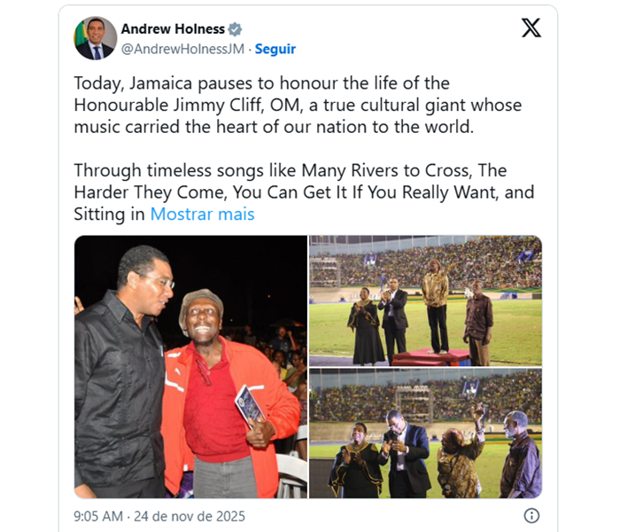 “Através de canções atemporais como ‘Many rivers to cross’, ‘The harder they come’, ‘You can get it if you really want’ e ‘Sitting in Limbo’, Jimmy Cliff contou a nossa história com honestidade e alma”, escreveu. “Sua música elevou as pessoas em momentos difíceis, inspirou gerações e ajudou a moldar o respeito global que a cultura jamaicana desfruta hoje. Agradecemos por sua vida, sua contribuição e o orgulho que ele trouxe à Jamaica. Estendo minhas mais sinceras condolências à sua família, entes queridos e a todos os jamaicanos. Sei que sentimos profundamente esta perda.Descanse em paz, Jimmy Cliff. Seu legado viverá em cada canto da nossa ilha e nos corações do povo jamaicano.”