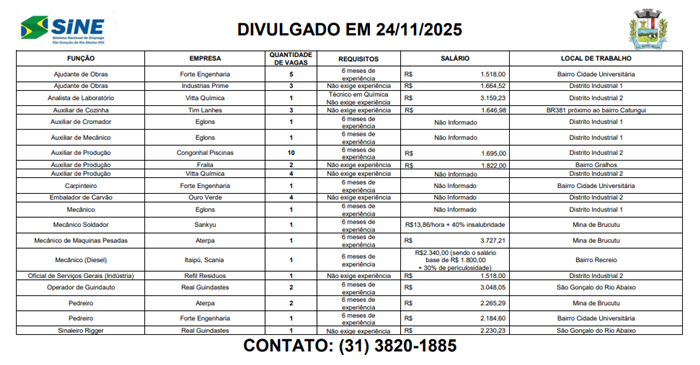 Segue a relação das vagas em aberto na data de hoje no SINE de São Gonçalo do Rio Abaixo – MG.