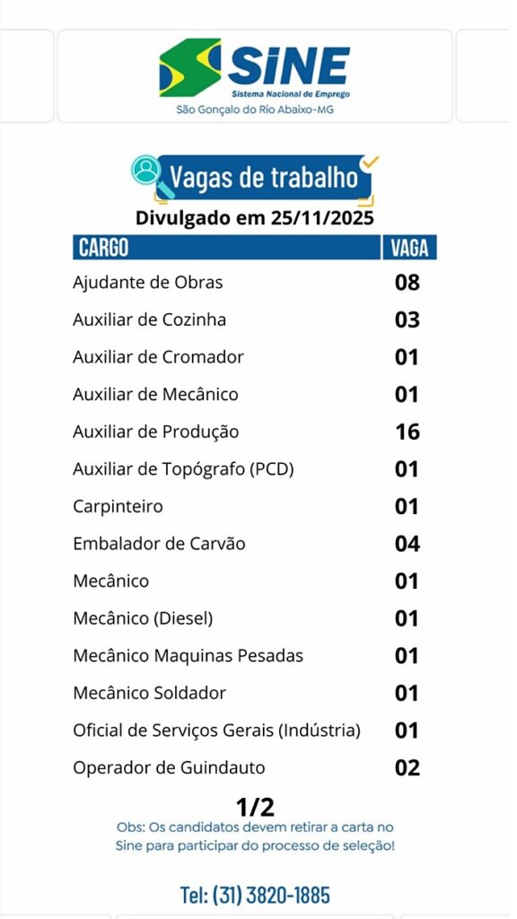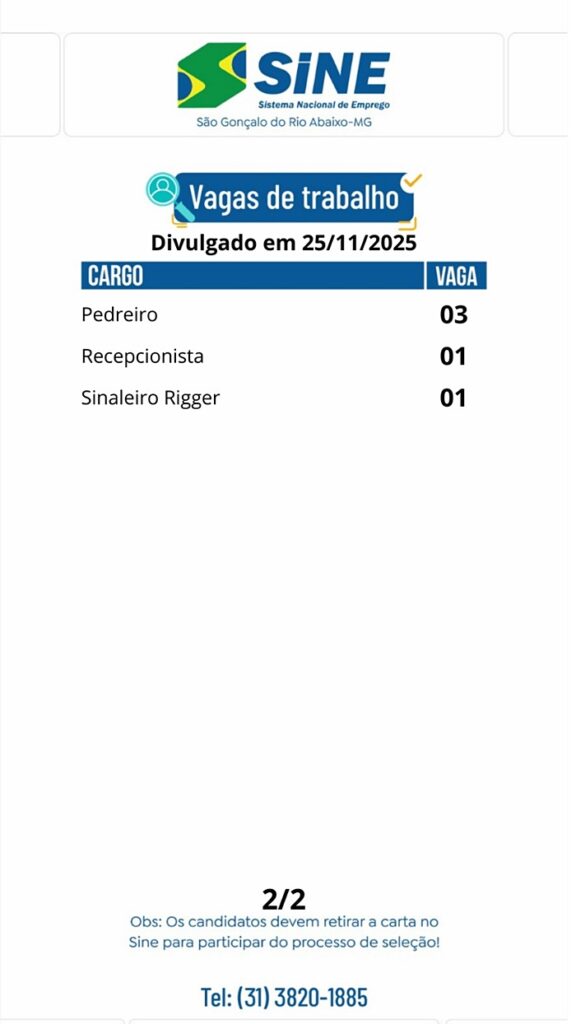 Segue a relação das vagas em aberto na data de hoje no SINE de São Gonçalo do Rio Abaixo – MG.