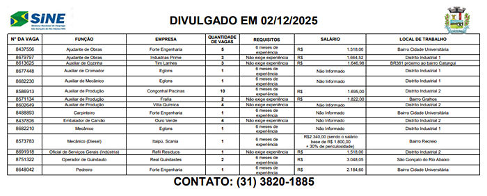Segue a relação das vagas em aberto na data de hoje no SINE de São Gonçalo do Rio Abaixo – MG.