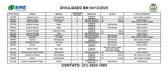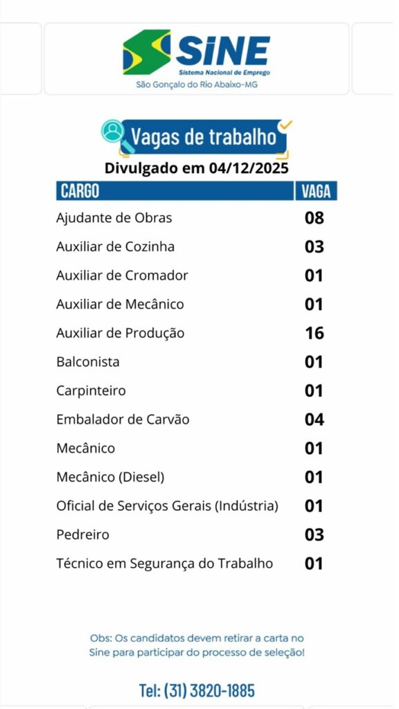 Segue a relação das vagas em aberto na data de hoje no SINE de São Gonçalo do Rio Abaixo – MG.