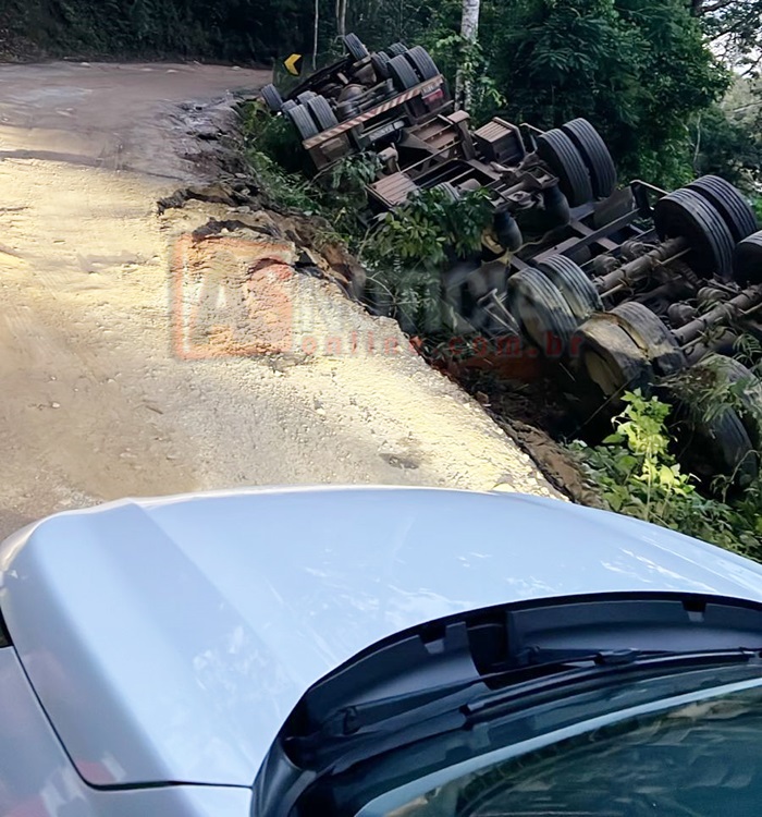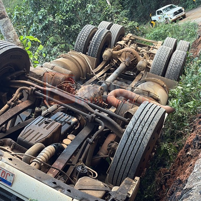 CARATINGA (MG)- Um tombamento de combinação de veículos, envolvendo um caminhão-trator e um semi-reboque, foi registrado na tarde dessa sexta-feira, 19 de dezembro de 2025, por volta das 17h45, na rodovia BR-474, altura do km 115, em Caratinga. O veículo parou às margens do Rio Manhuaçu, ocasionando o derramamento de parte da carga no leito do rio.