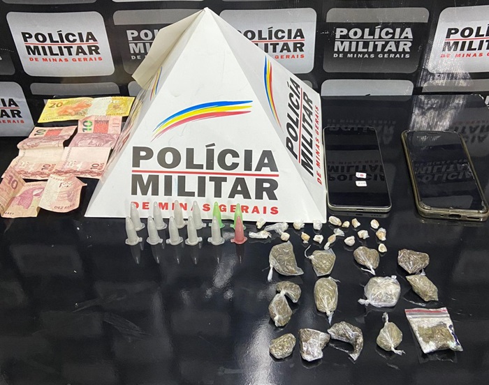 Durante as diligências, os militares localizaram e apreenderam diversos materiais ilícitos, entre eles 16 pinos de cocaína, 13 buchas de maconha, 17 pedras de crack, além de dois aparelhos celulares e a quantia de R$ 50,00 em dinheiro.
