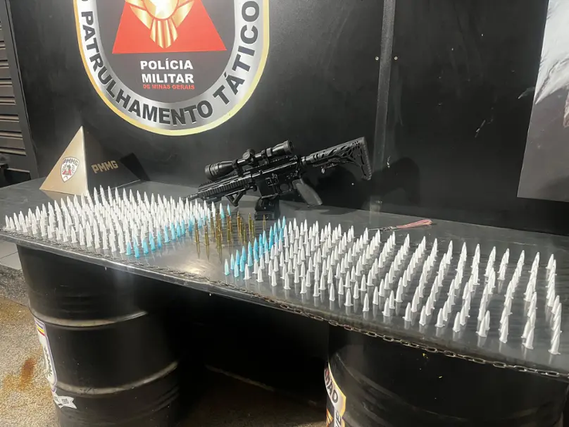 Durante o patrulhamento com foco no combate ao tráfico de drogas e armas, a Polícia Militar de Minas Gerais (PMMG), por meio do 27º BPM, da 4ª RPM, apreendeu um fuzil Cal. 5.56, dois carregadores de calibre 5.56, uma luneta para fuzil do mesmo calibre, 18 cartuchos intactos Cal. 5.56 e 524 pinos de cocaína. Um suspeito de 28 anos foi preso.