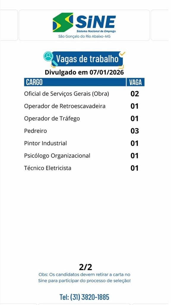 Segue a relação das vagas em aberto na data de hoje no SINE de São Gonçalo do Rio Abaixo – MG.